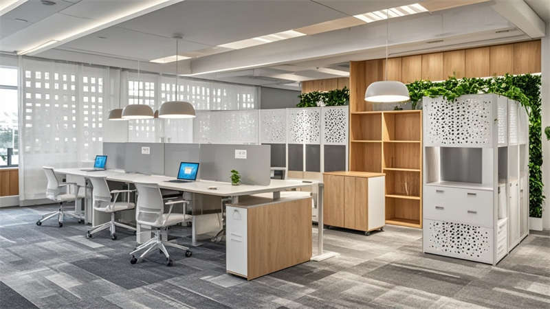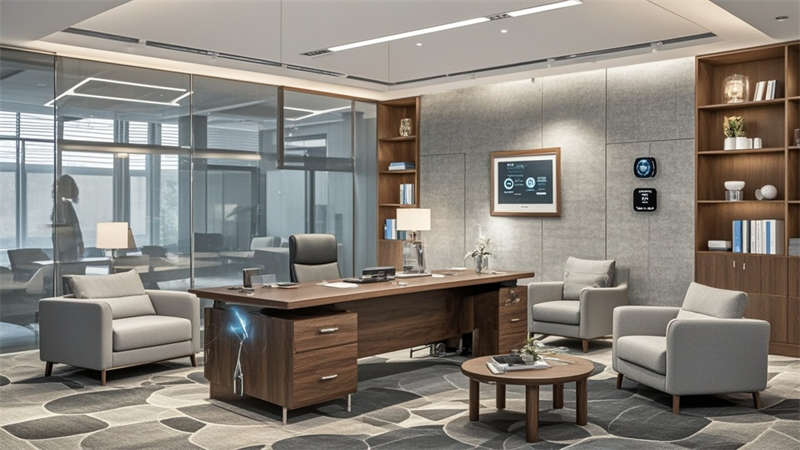 ④聲學吊頂確保35分貝以下靜音環(huán)境。色彩搭配采用70%淺灰奠定基調(diào),20%原木色增添溫暖,10%企業(yè)藍作為點睛色。環(huán)保方面選用LEED認證材料,集成光伏玻璃幕墻年發(fā)電量達8萬度。