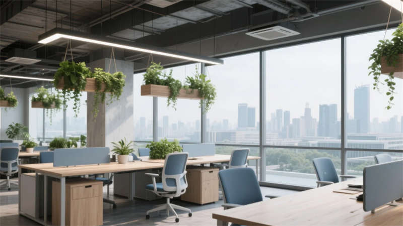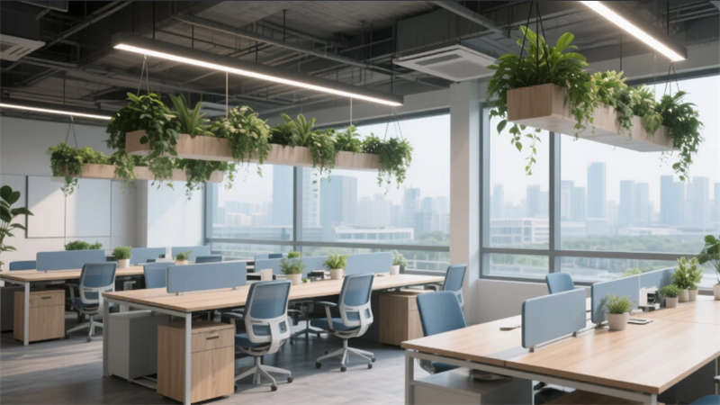 該辦公空間以"自然共生"為核心理念,將科技感與人文溫度融入兩千平米的開(kāi)放場(chǎng)域。流動(dòng)的淺木色調(diào)貫穿始終,啞光金屬與微水泥形成質(zhì)感對(duì)話,模塊化家具構(gòu)建靈活場(chǎng)景。綠植生態(tài)系統(tǒng)從空中吊籃蔓延至苔蘚墻面,模糊室內(nèi)外界限。