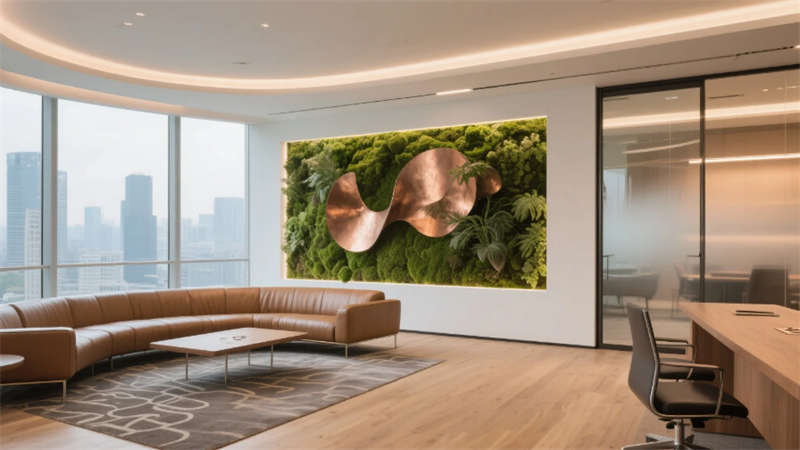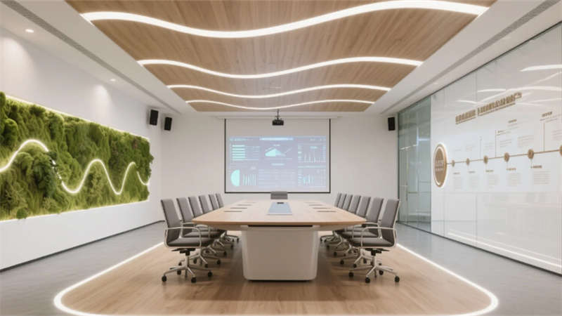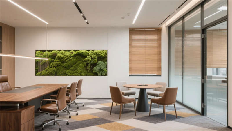生態(tài)科技體系覆蓋全場景:經(jīng)理辦公室苔蘚墻集成空氣監(jiān)測系統(tǒng),總裁室霧化玻璃聯(lián)動(dòng)光伏發(fā)電,小會議室綠植墻搭載微滴灌節(jié)水裝置。材質(zhì)選用安徽本土元素升級再造,大廳水磨石摻入大別山礦石粉,定制地毯紋樣提取徽派窗欞數(shù)字化變體。