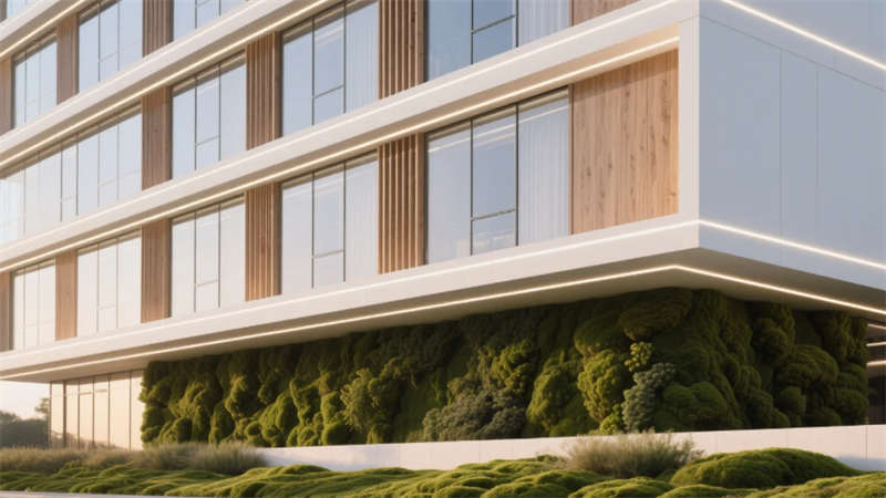 本案立足合肥科技創(chuàng)新城定位,以“自然滲透科技”為核心策略,打造7000㎡智慧辦公綜合體。外立面通過雙層呼吸式幕墻與垂直木紋格柵交織,形成動(dòng)態(tài)光影濾網(wǎng),底部苔蘚景觀帶同步凈化PM2.5,實(shí)現(xiàn)建筑與巢湖生態(tài)區(qū)氣候的有機(jī)對話。