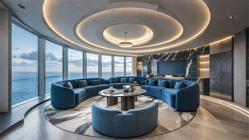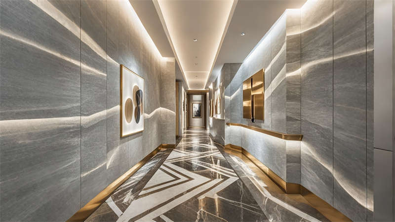 色彩體系以香檳金與深海藍(lán)為主調(diào),大堂采用香檳金金屬線條勾勒建筑肌理,搭配深海藍(lán)大理石營造視覺重心。客房區(qū)運用暖灰硬包墻面平衡色彩強(qiáng)度,通過2700K暖光與4000K中性光分區(qū)照明塑造晝夜場景。材質(zhì)組合注重層次:大理石地面、金屬構(gòu)件、絨布軟包形成質(zhì)感三部曲。
